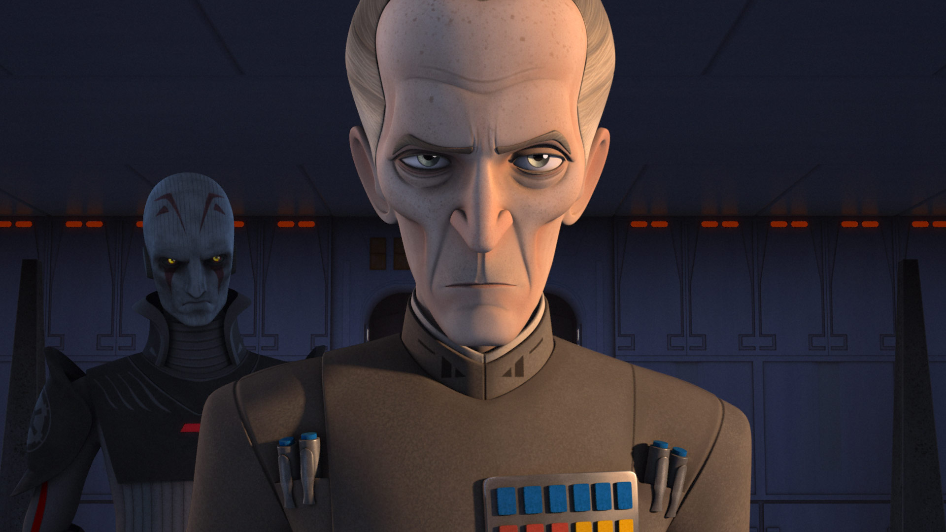 The three part finale Call to Action, Rebel Resolve and Fire Across the Galaxy pack a lot of fantastic moments, but for my money none are better than those that involve the ruthless, methodical left hand of the Empire, Grand Moff Tarkin. These episodes are easily the series most cinematic, with an imp[ressive amount of care going into lighting, shot choices, and editing, best exemplified in the sequence where Tarkin wordlessly orders two failed imperials execution, told through Leone-esque close-ups of the eyes of all in the room before the Inquisitor ignites his blade. There are some clever little storytelling techniques that add suspense, like the moment where Tarkin expounds upon the various other cells of rebels, reminding you once again that the Lothal crew are far from the only ones, robbing you of the assurance that "they can't die, cause they're the start of the rebellion". They in fact can die, and you really think they might, especially when Kanan tells Ezra to flee while he stays back to fight the Inquisitor, recalling Obi-Wan's fateful instruction to Luke in Episode IV.